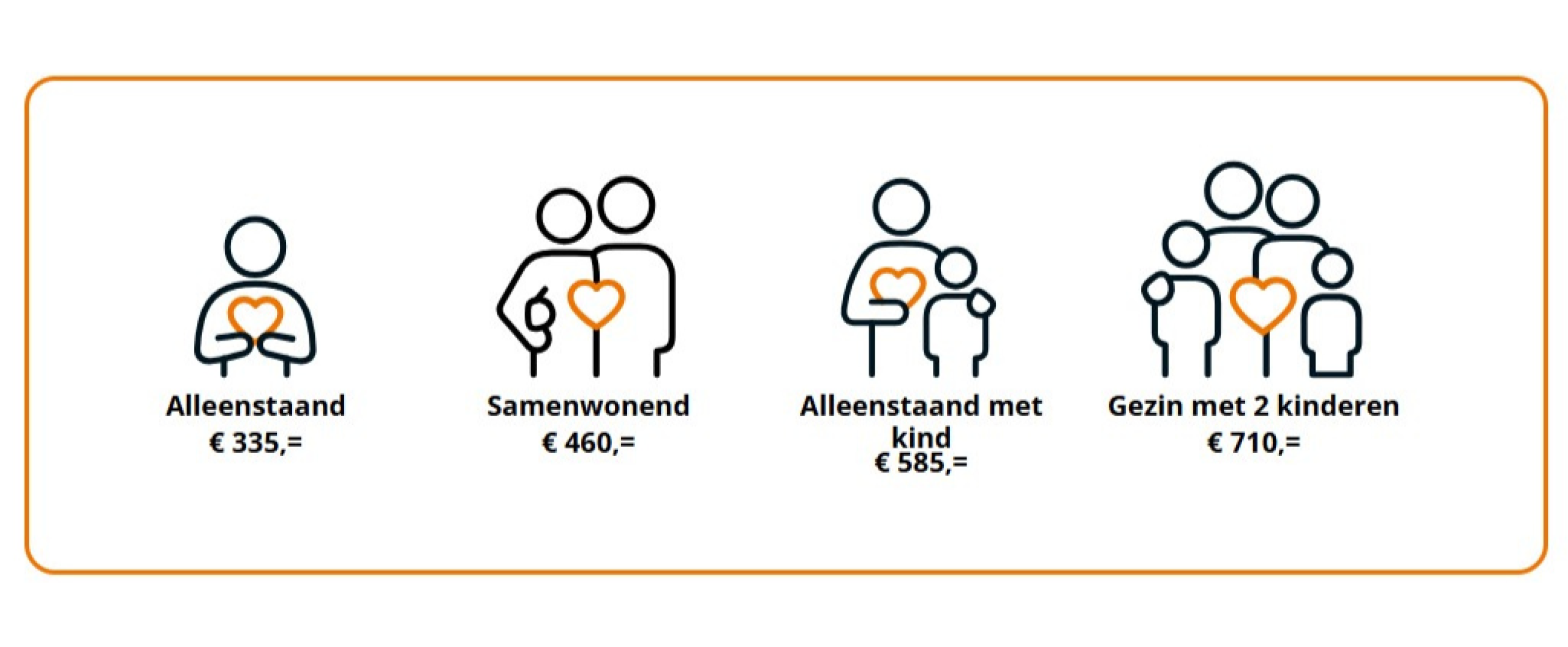Je kunt voedselhulp krijgen als je na het betalen van je vaste lasten te weinig geld overhoudt voor eten en andere belangrijke dingen. Hieronder zie je bedragen bij verschillende soorten gezinnen. Houd je per maand minder geld over dan dat bedrag? Dan kun je hulp krijgen.
